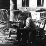 “A Day in the Life of Delaware Valley; Afternoon” 6:00 p.m. (10-21-01), Philadelphia. Robert Loweski reads a book on a park bench in front of Independence Hall. Taina Rohrman, Basic Photography Fall 2001